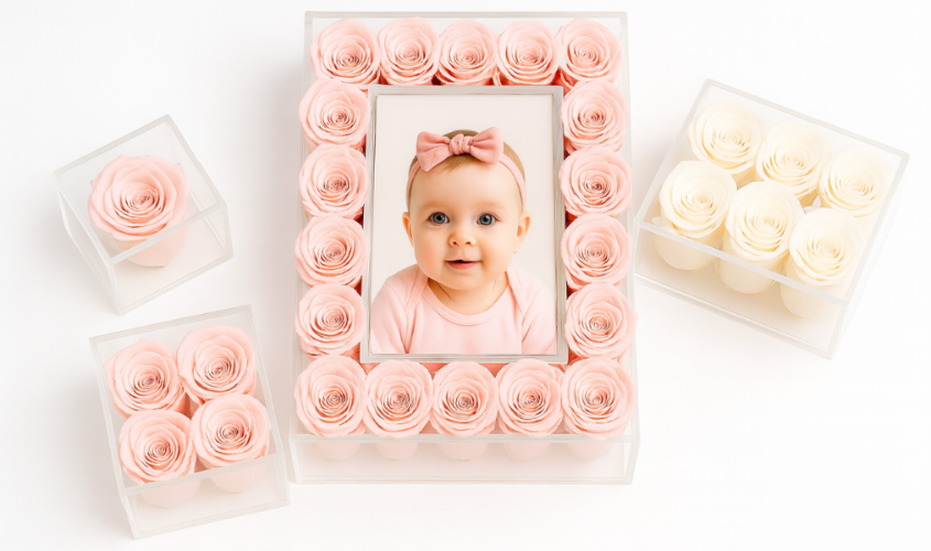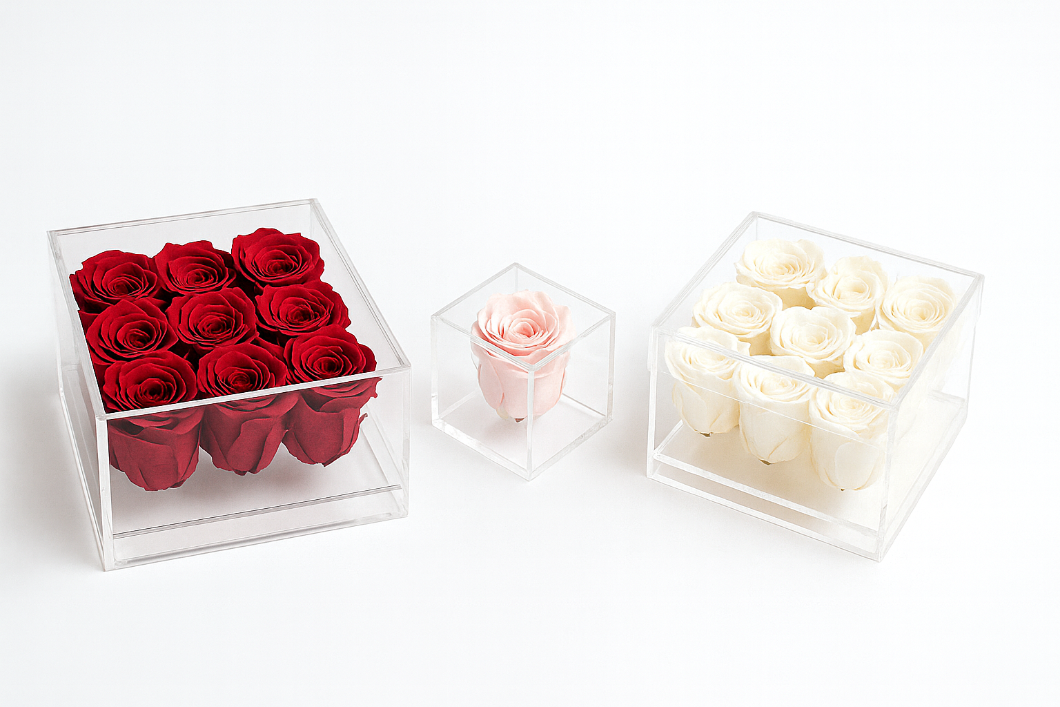 9 Rosas Preservada en caja acrílica Deluxe con borde en rhinestones